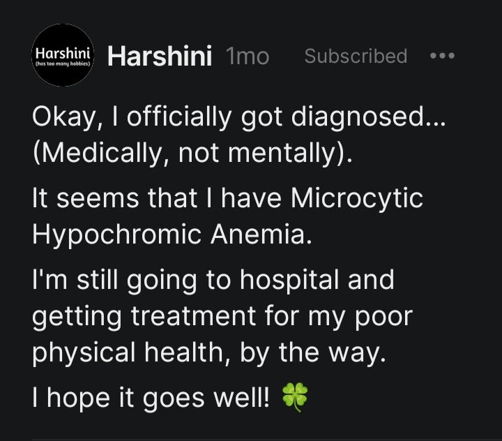 I had to regularly go to the doctors because the medical test report showed that I have Microcytic Hypochromic Anemia, which isn't an official diagnosis, but it's an indicator that I may have an underlying health problem.