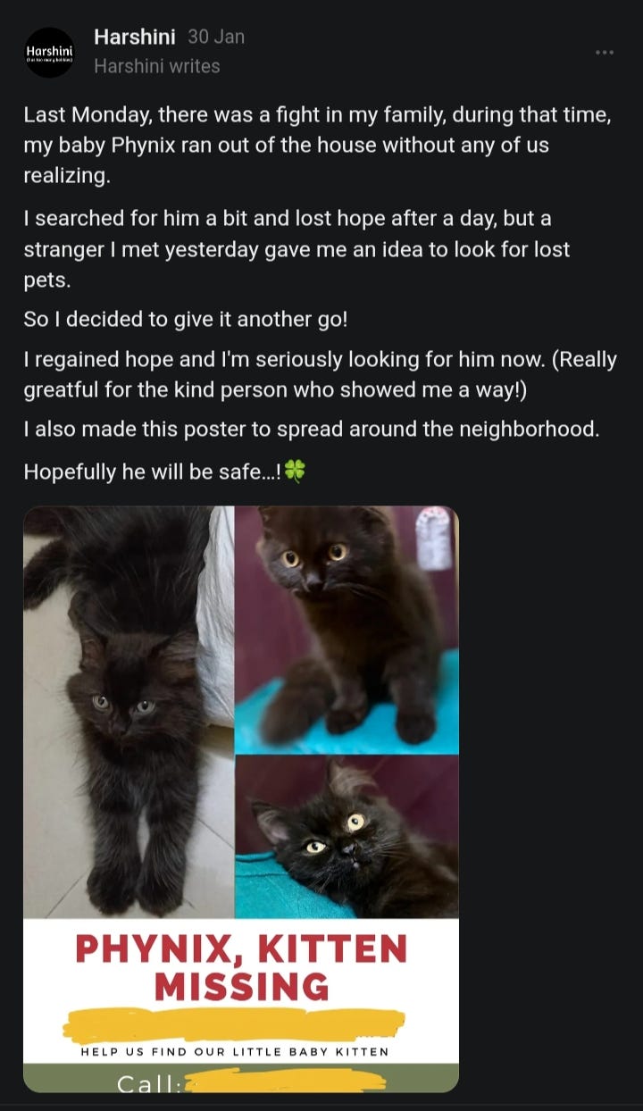 A few moments later, I realised he went missing, cried, and looked for him for a few days. I quickly made a missing poster (that you saw in the note). And posted it online and showed it to a few locals, who were not that many.