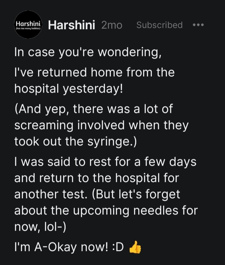 The doctor there was a nice person. She took a lot of tests and said that I don't have a disease and that I don't have to worry. But I do have to take some medicine.