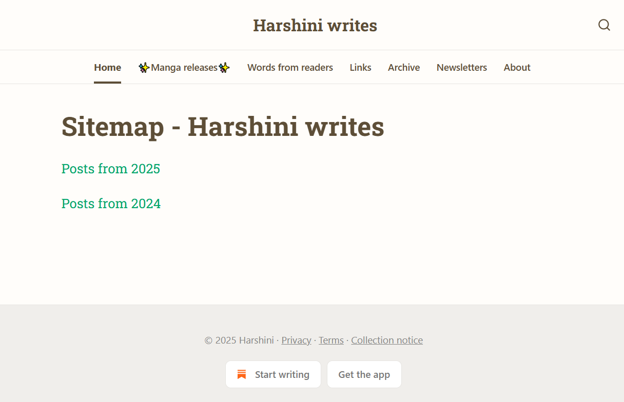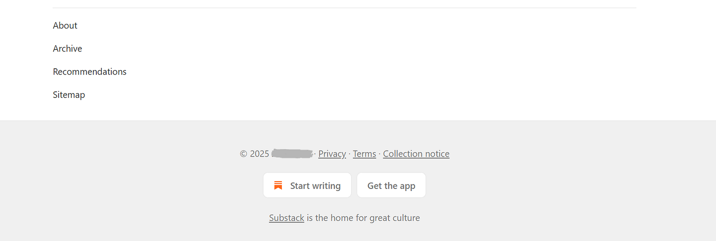 I also looked at some other Substack publications. Interestingly, the websites that were customized didn't have a visible sitemap or that little section. And the publications that used the default Substack website layout– had that whole section.