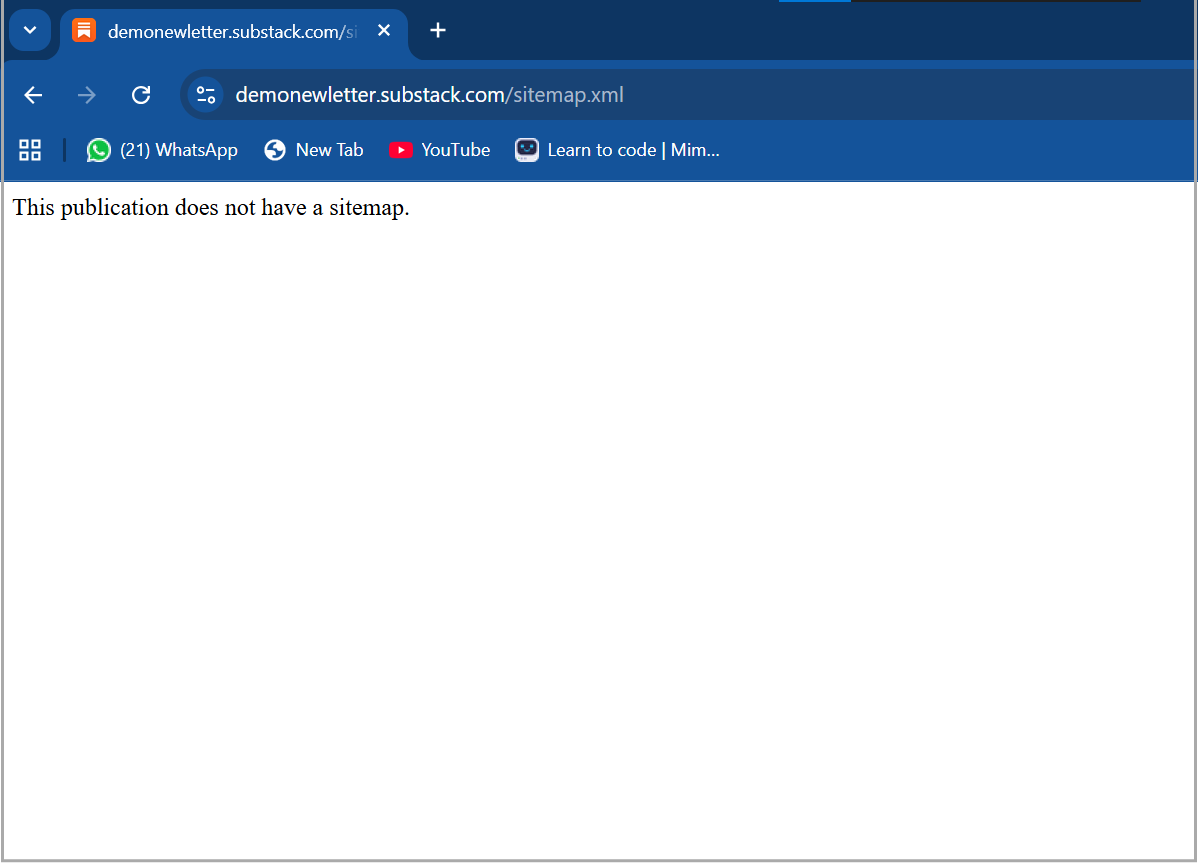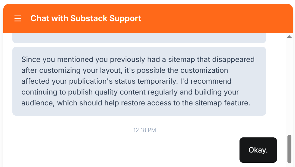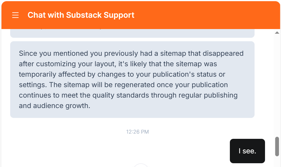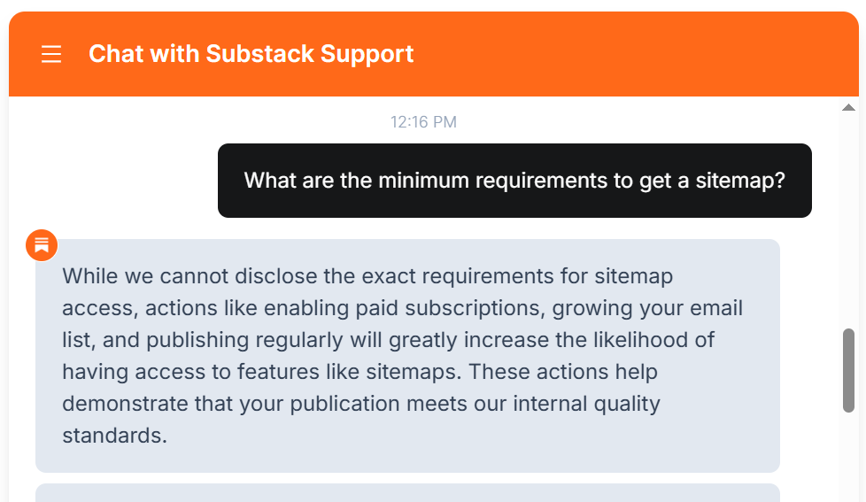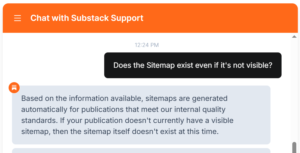 This proves it. Newer Substack publications truly don’t get a sitemap. And their publication has to grow a bit, to be qualified to get one. (How much do they need to grow? I don’t know. That’s what the Substack Support Bot is refusing to tell us).