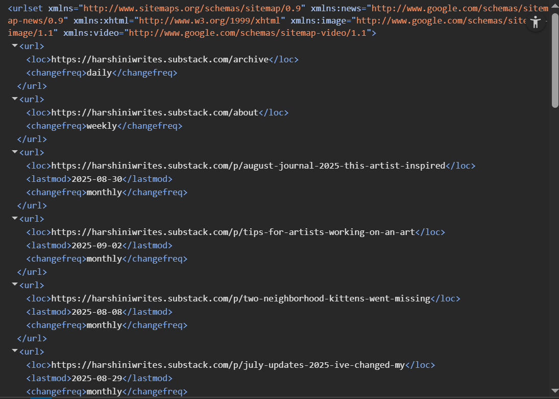 Next, add this to the end of your website’s URL: “/sitemap.xml” to find your sitemap. I searched: “harshiniwrites.substack.com/sitemap.xml” to find mine.