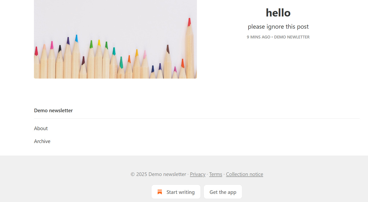 I made a new Substack account, finished setting up the basic settings, made a publication named “Demo newsletter”, scrolled to the bottom, and…