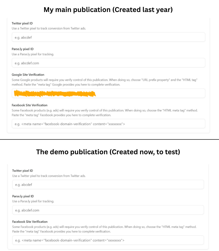 Here’s how to check if you have that option: Go to your publication’s settings, and scroll down to a section called “Analytics”. You may see an option named “Google Site Verification.”
