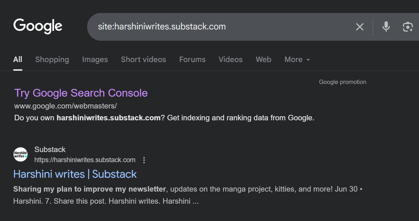 Example: my Substack publication’s name is “Harshini writes”, so I have to search “harshiniwrites.substack.com”.